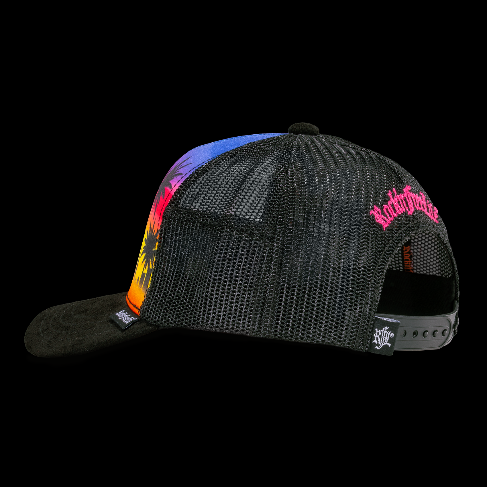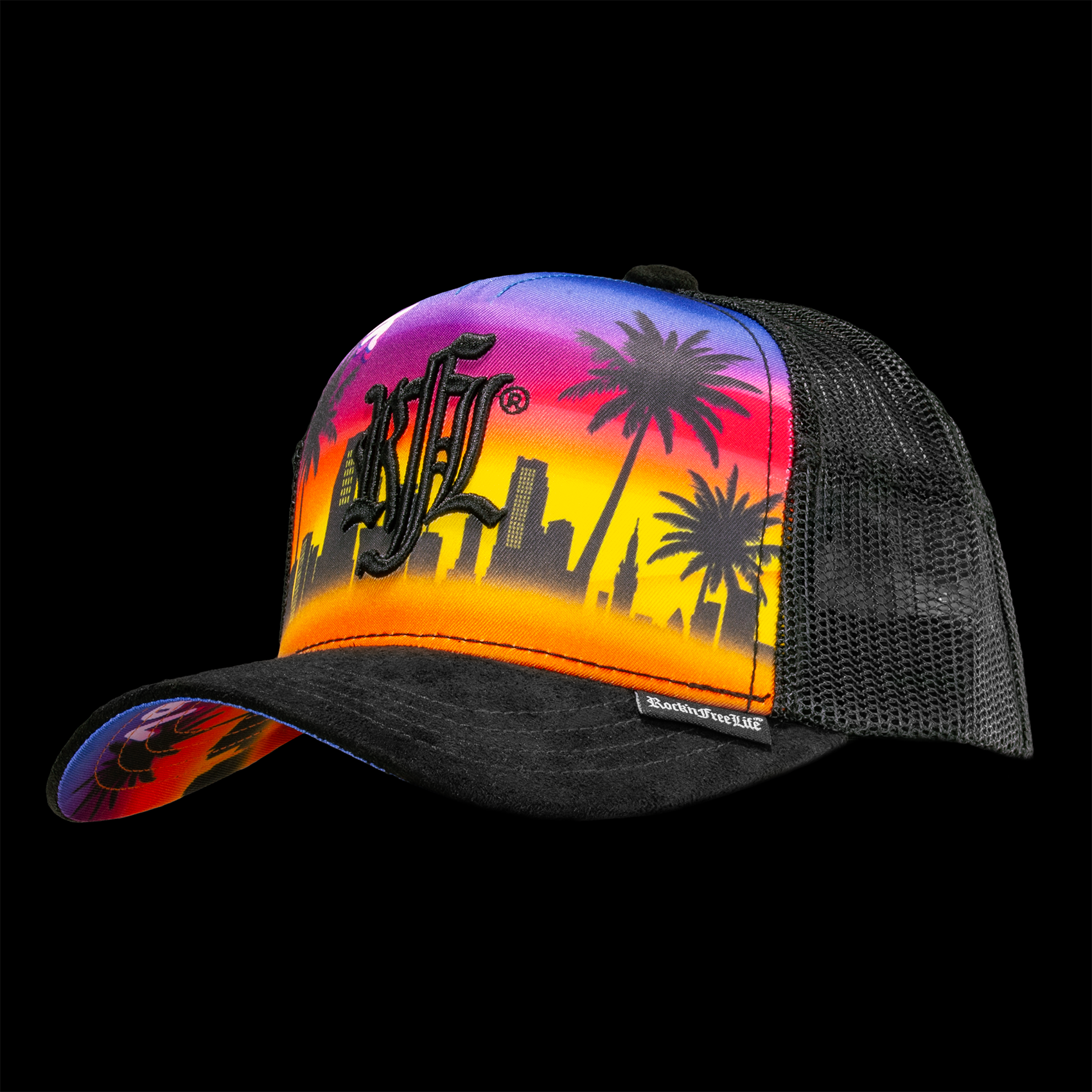 • Visière arrondie dessus suédine noire, dessous print inspiration "miami"