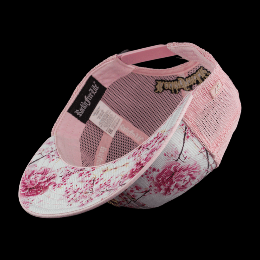 • Visière plate dessus rose pale, dessous visière print fleurs de cerisiers