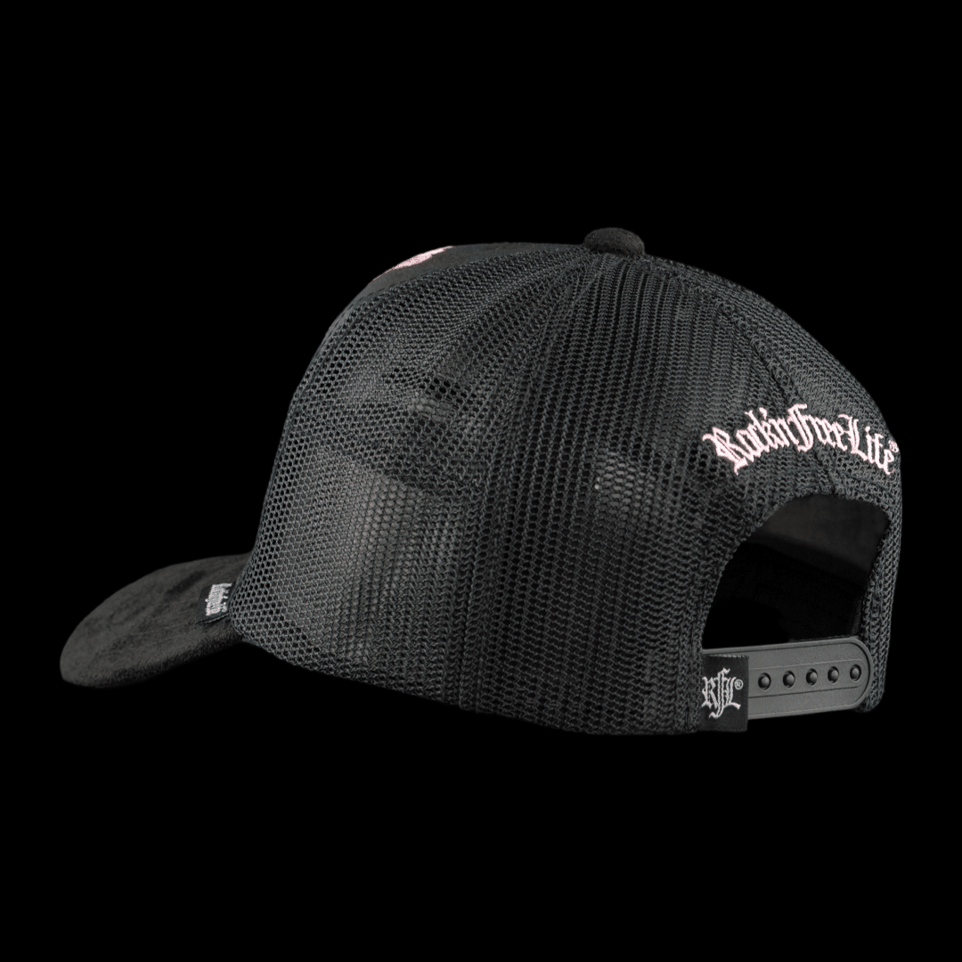 • Visière arrondie suédine noire avec broderie flat RFL® rose sous visière