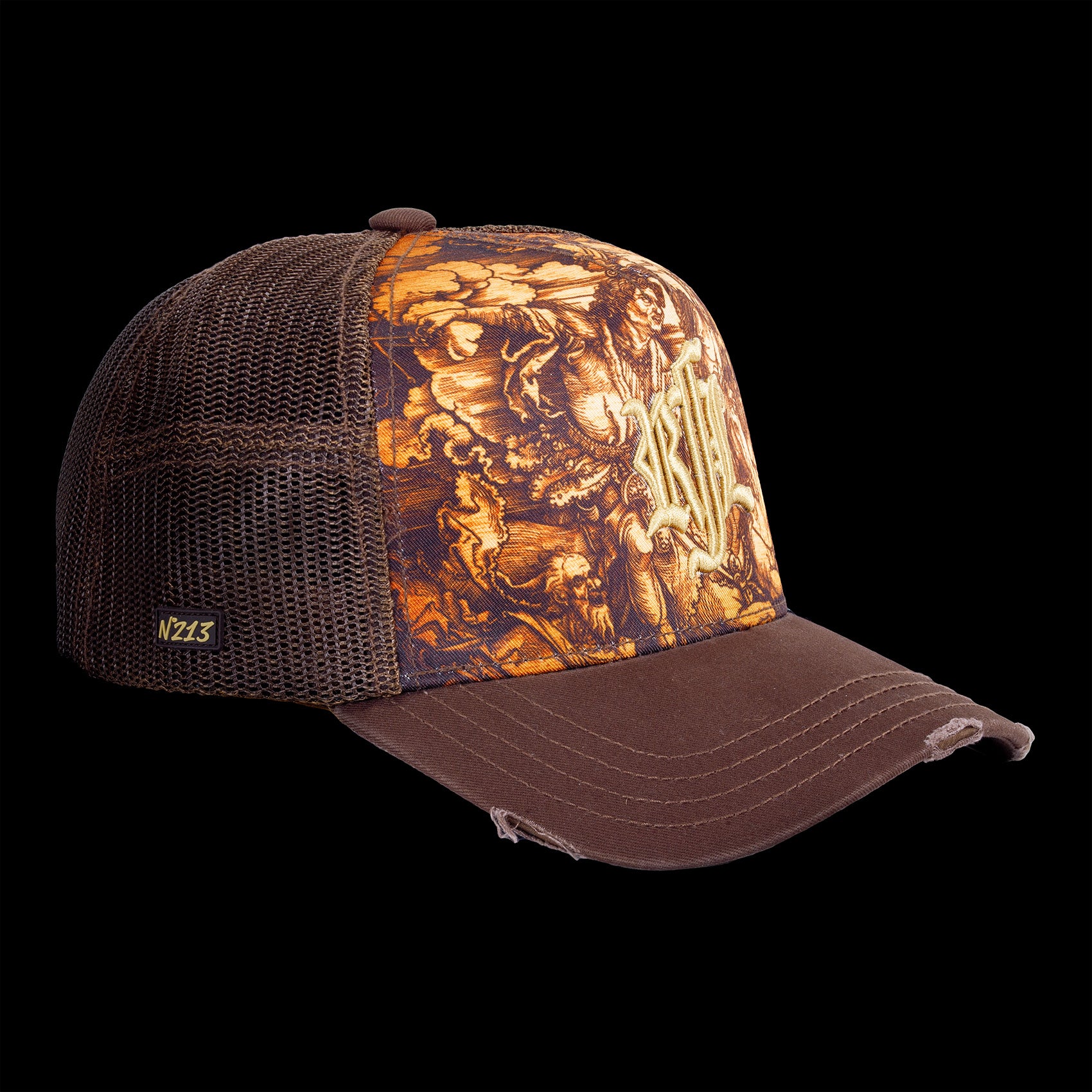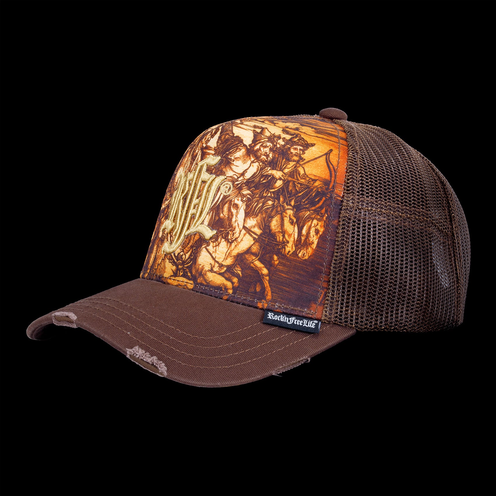 Quand la grande peinture classique s?invite dans la rue. La MASTERPIECE juxtapose un tableau baroque flamboyant à l?ADN rebelle de Rock?nFreeLife® : couleurs sépia brûlées, cavaliers épiques et éclats dorés se bousculent sur la couronne, comme un musée roulant? mais en plus sauvage.